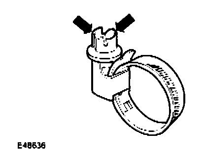 Oetiker clips may be removed by bending the tag (arrowed) and releasing the free end of the clip. Clips must not be reused. When fitting new clips, ensure clip is positioned on hose before tightening and ensure that when clip is tightened, the tag is located in the longitudinal slot in the free end of the clip (arrowed in illustration).