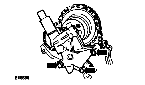 14. Install the RH secondary timing chain tensioner retaining bolts.