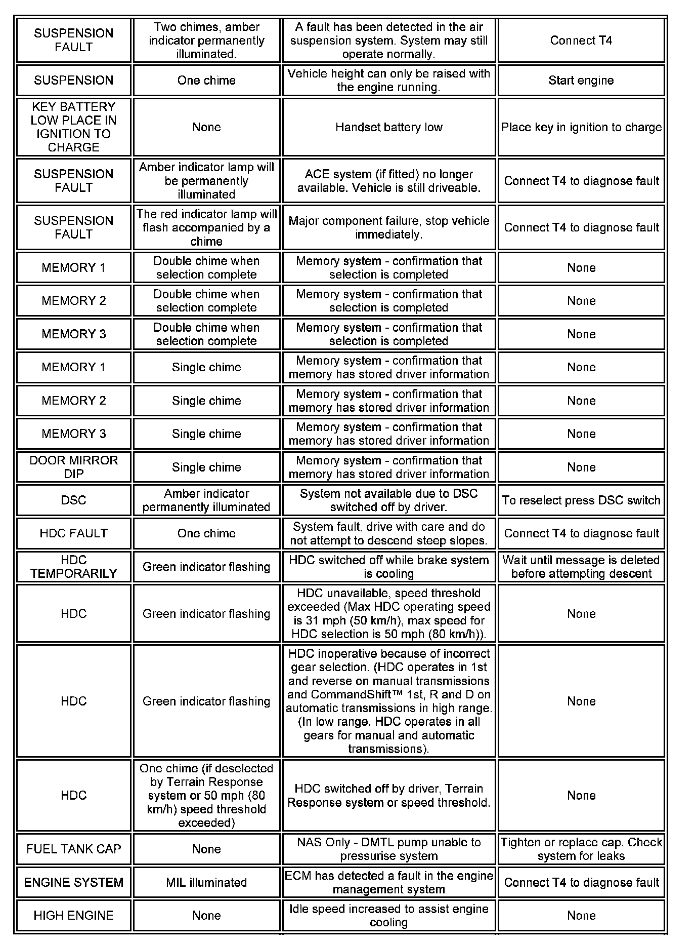 The messages are displayed in a language applicable to the market configuration of the vehicle and can be changed using T4. The following list shows the possible messages which can be displayed, other visual or audible warnings and a description of the message.