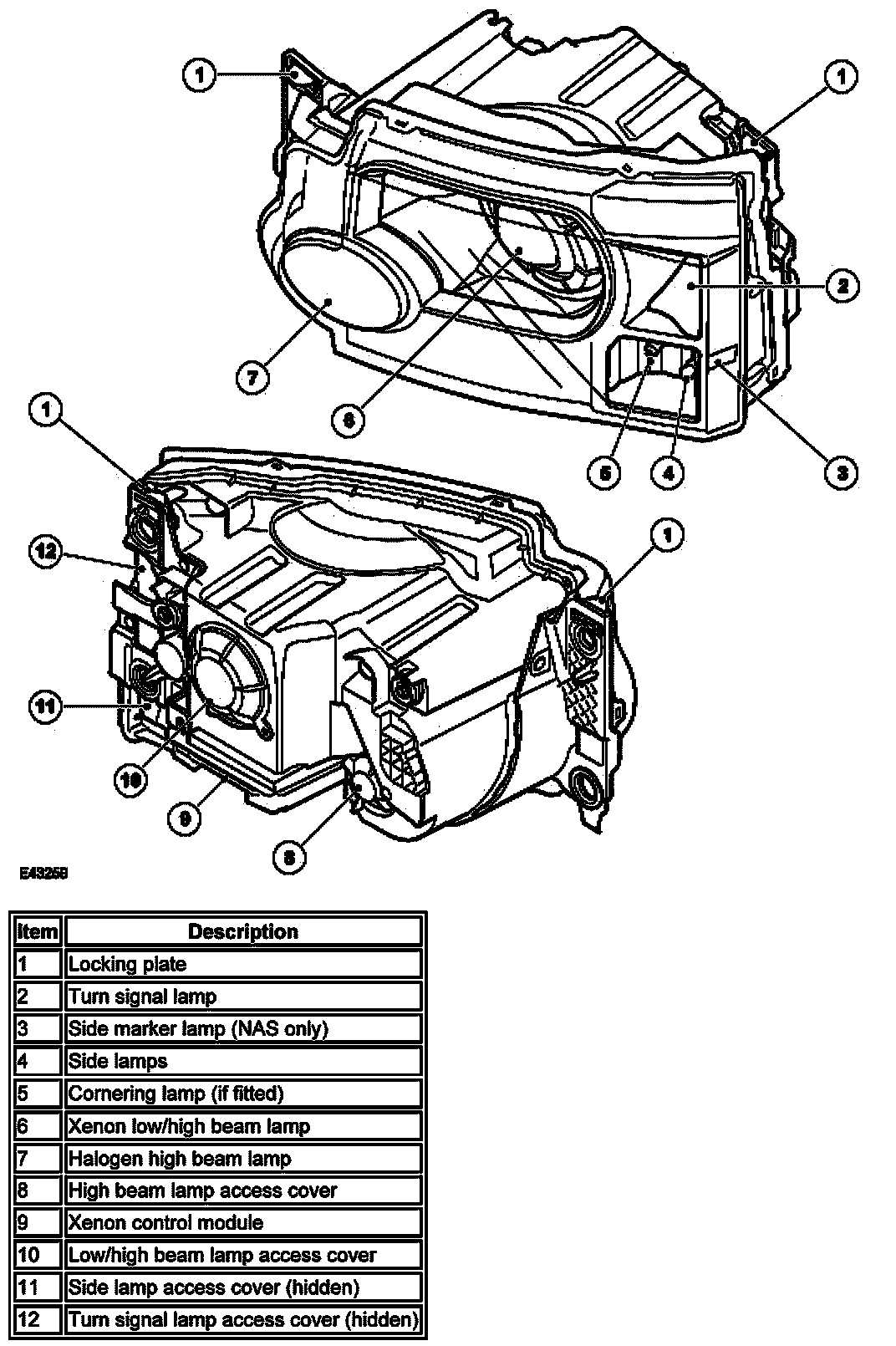 headlamps. Another removable cover provides access to the high beam only halogen bulb which is retained with a spring clip. A smaller cover can also be rotated anti-clockwise to provide access to the turn signal lamp bulb. Below this cover is a removable cover which provides access to the side lamp bulb, the cornering lamp/static bending lamp bulb and the side marker lamp bulb on NAS models.