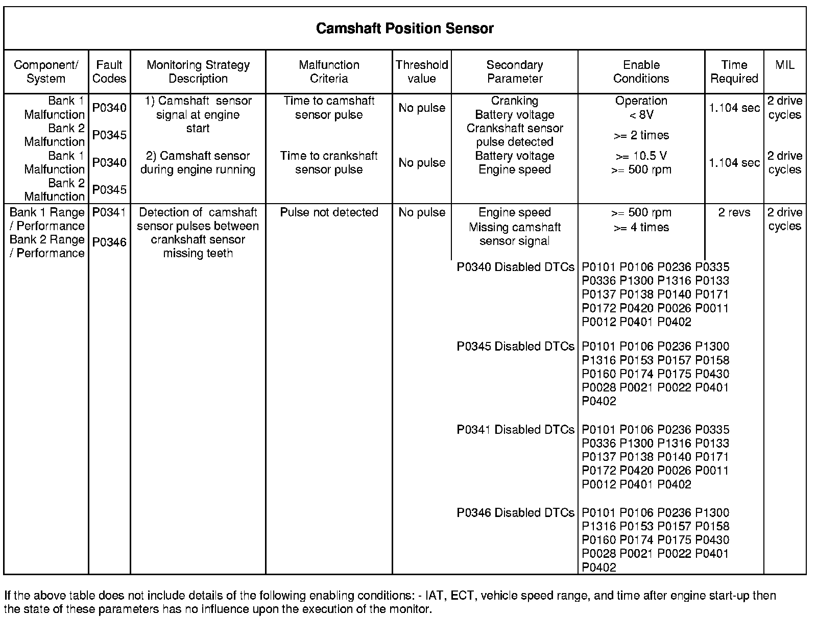 Additionally if a camshaft sensor pulse is not detected between crankshaft sensor missing teeth on more than 4 occasions then a fault event is recorded. If the fault is registered on 2 drive cycles then the MIL will illuminate.