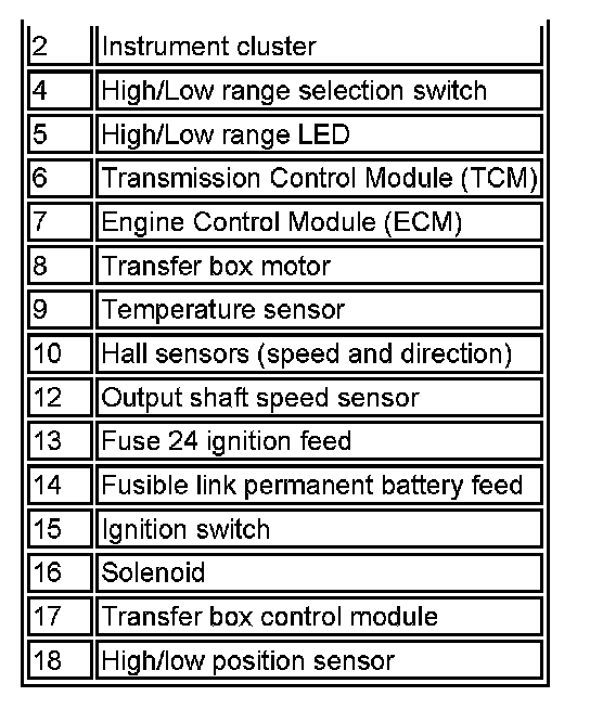 If a fault occurs with the transfer box, the transfer box control module or one of the required input signals, the control module records a fault code and will respond appropriately to provide the highest level of system capability under the specific fault conditions. The following fault states are possible: