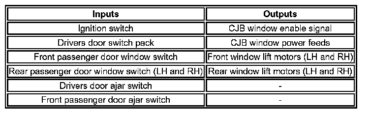 Power for window operation is supplied from the window lift relay located in the CJB. When energized, the window lift relay provides feed to the following fuses, which are also located in the CJB: