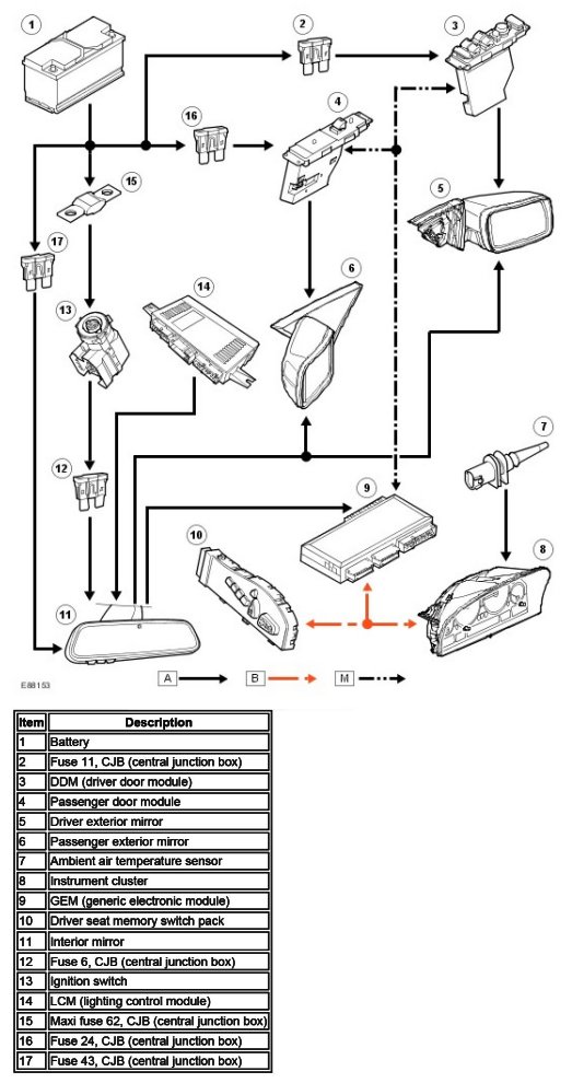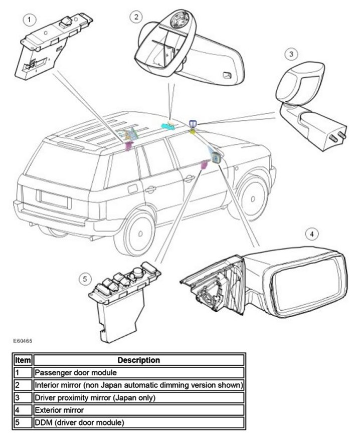 Operation of the exterior mirrors is controlled by the 2 front door modules and the GEM (generic electronic module). The door modules and the GEM (generic electronic module) communicate with each other on a P bus. The switches for adjustment and folding of the exterior mirrors are incorporated into the DDM (driver door module). The door modules interpret the P bus signals and control switch inputs into appropriate outputs for the exterior mirrors. For operation of the various exterior mirror functions the 2 door modules are powered by a permanent battery feed from the CJB (central junction box).