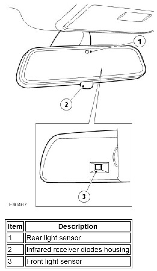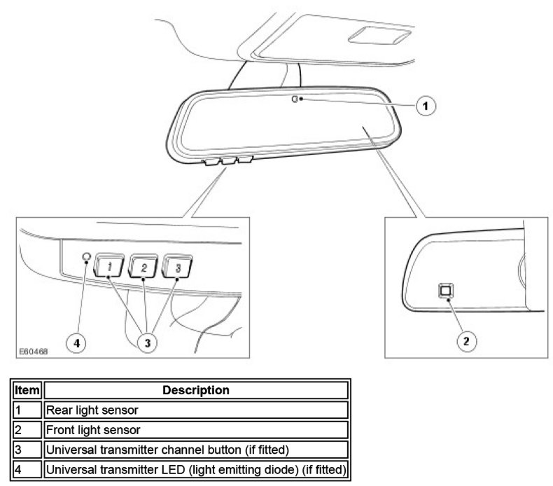 The interior mirror is installed on a stud bonded to the windshield. Trim finishers cover the mounting stem of the interior mirror and, where fitted, the rain/light sensor. The interior mirror incorporates either manual or automatic dimming, depending on market and trim level. Some vehicles may also incorporate a HomeLink� universal transmitter. Manual dimming is performed by rotating a knob on the underside of the mirror. Automatic dimming is performed by electrochromic mirror glass.