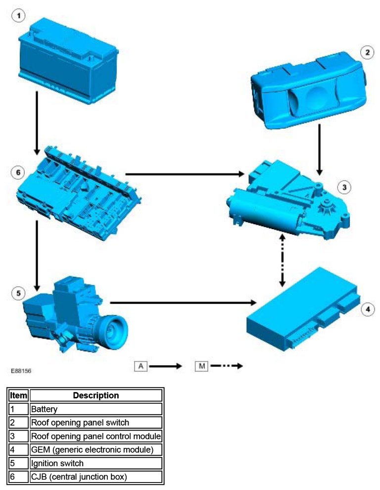 If the voltage supplied to the roof opening panel control module drops below 9.5 V, any one-touch operation currently in progress will be terminated and no new roof opening panel movement will be initiated.