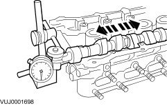 ^ Slide the camshaft in both directions. Read and note the maximum and minimum values on the dial indicator gauge.