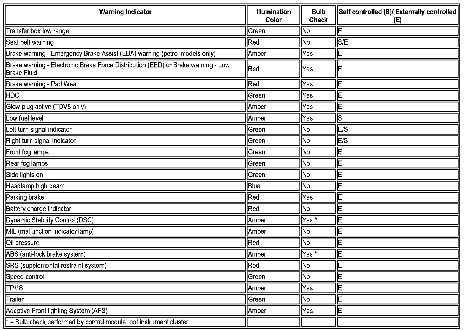 Self controlled indicators are dependant on software logic within the instrument cluster for activation. The cluster software controls the indicator check illumination at ignition on and all indicators whose operation is wholly controlled by the cluster, the low fuel level warning indicator for example.