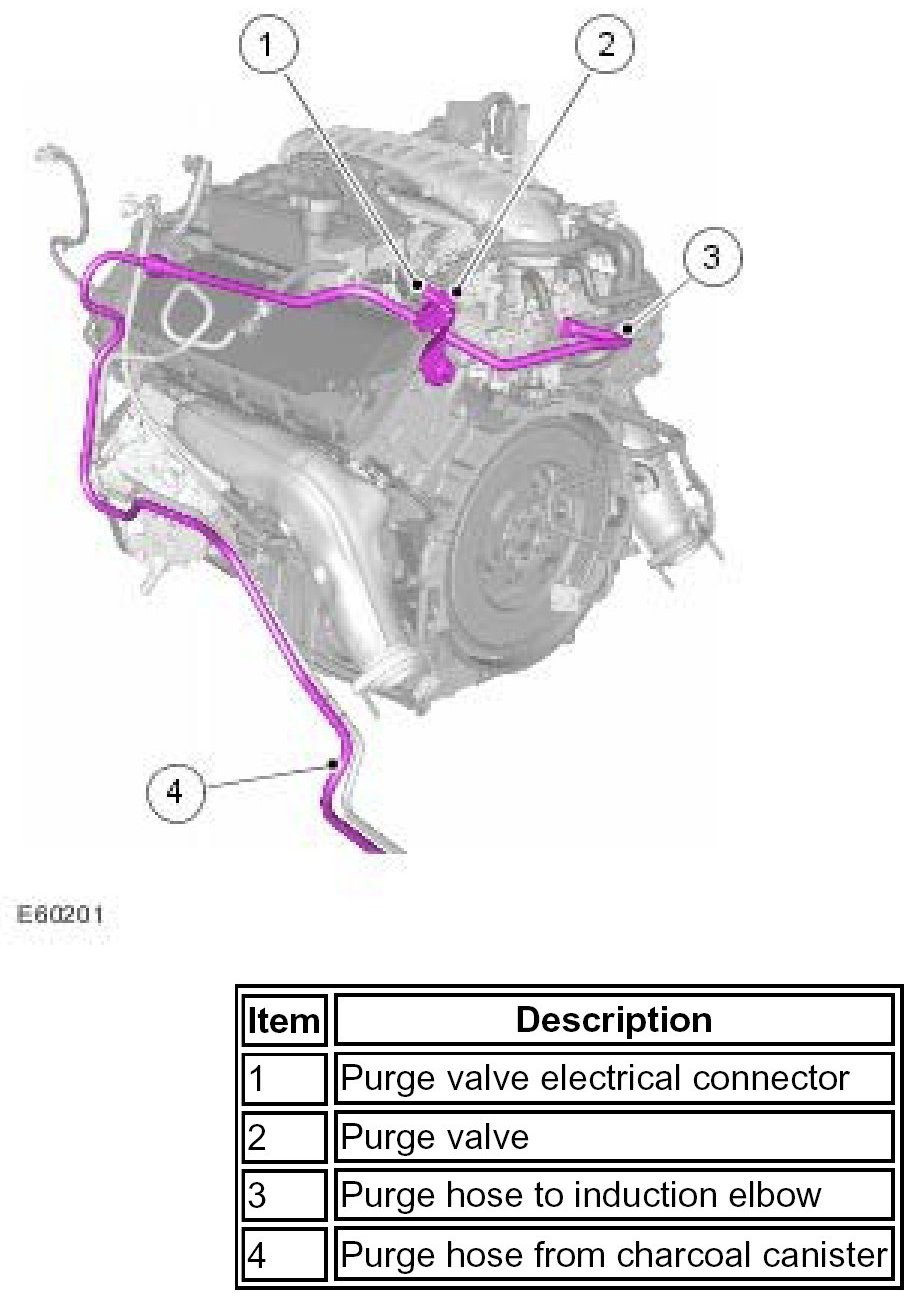 The purge hose is routed from the purge valve, along the top of the left hand rocker cover to a quick release coupling. From the coupling, the hose is routed down the left hand side of the engine compartment to the purge line which runs parallel with the fuel feed line along underside of the vehicle and across the top of the fuel tank to the charcoal canister.