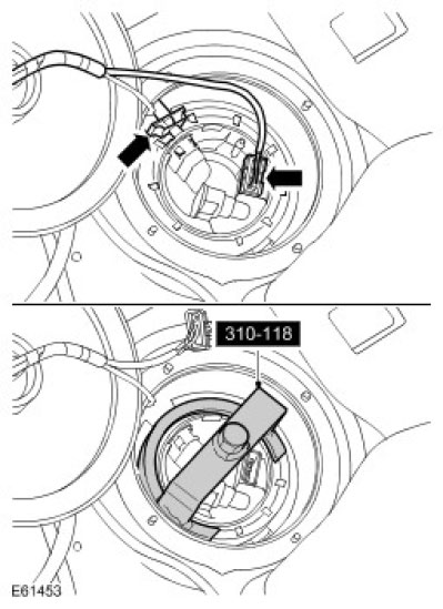 ^ Depress the clips and release the lower part of the pump and sender unit rearward.