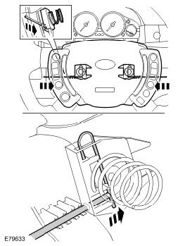 3. Release the 2 clips from the driver air bag module using a rod at least 50 mm (2 inches.) long and not exceeding 3 mm (1/8 inch.) diameter. Install the rod through each access hole in the steering wheel control switches at right angles to the steering column. Locate the secondary hole and carefully push on the rod until the clip is released.