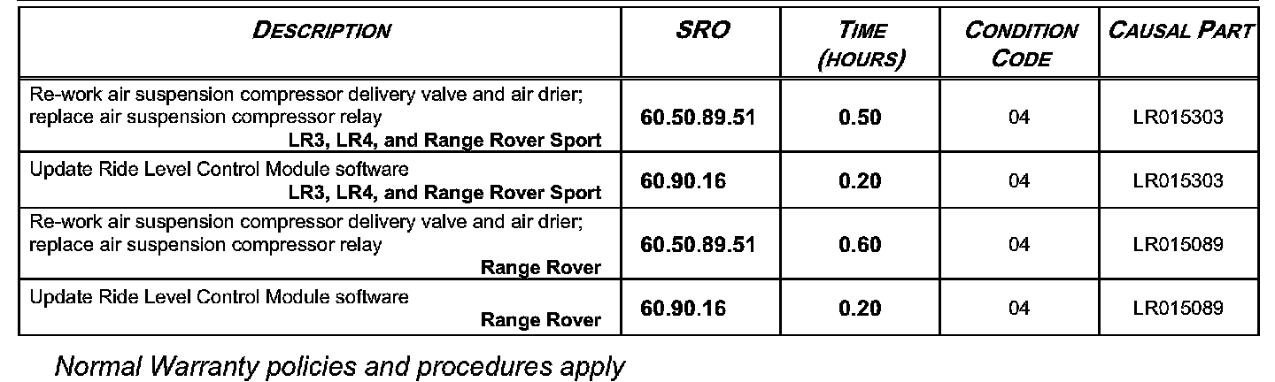 Air Suspension Compressor Delivery Valve / Drier / Relay Replacement; Software Update