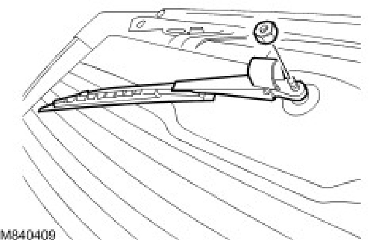 ^ Raise the nut cover on the rear window wiper pivot arm and remove the nut.