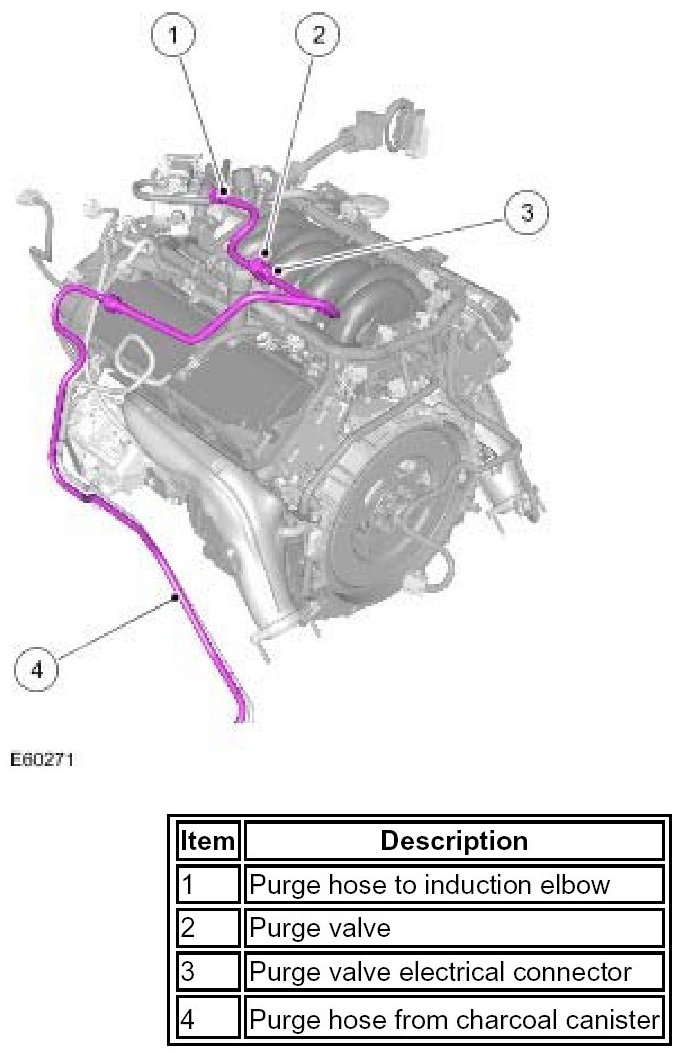 The purge hose is routed from the purge valve, along the top of the left hand rocker cover to a quick release coupling. From the coupling, the hose is routed down the left hand side of the engine compartment to the purge line which runs parallel with the fuel feed line along underside of the vehicle and across the top of the fuel tank to the charcoal canister.