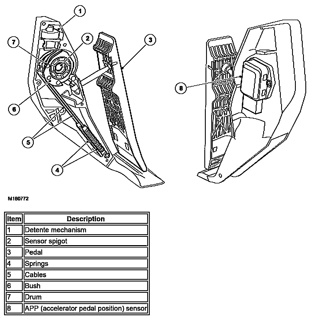 The APP (accelerator pedal position) sensor is located in a plastic housing which is integral with the throttle pedal. The housing is injection molded and provides location for the APP (accelerator pedal position) sensor. The sensor is mounted externally on the housing and is secured with two Torx screws. The external body of the sensor has a six pin connector which accepts a connector on the vehicle wiring harness.