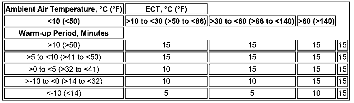 The duration of the engine warm-up period depends on the ambient air temperature and the ECT (engine coolant temperature) when the ignition is switched on, as detailed in the following table:
