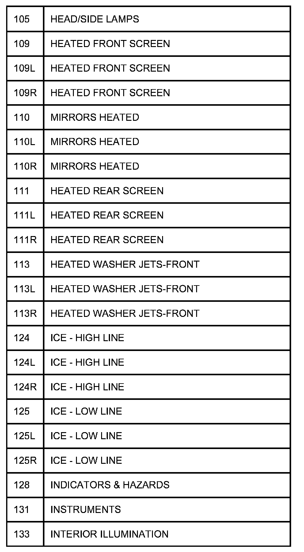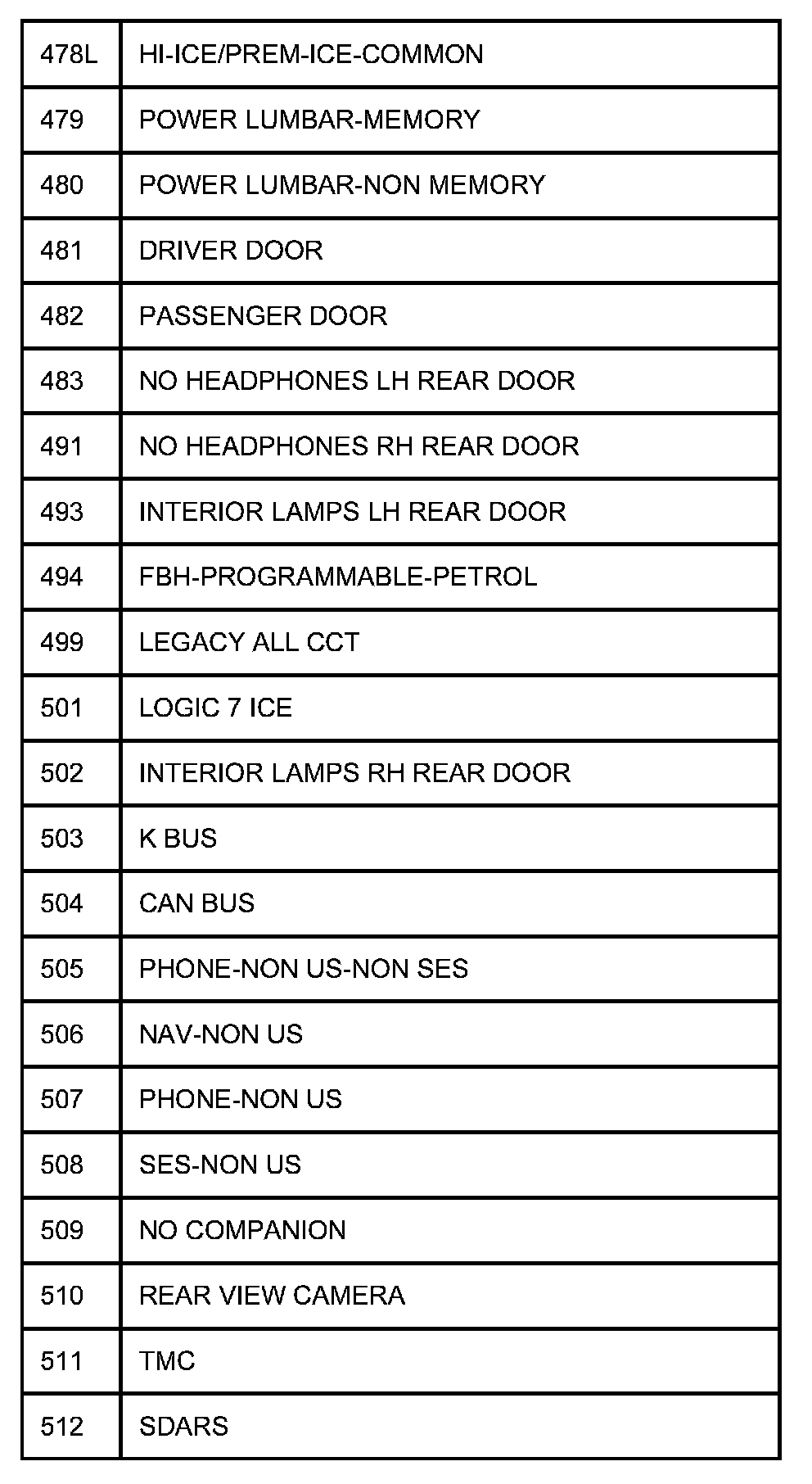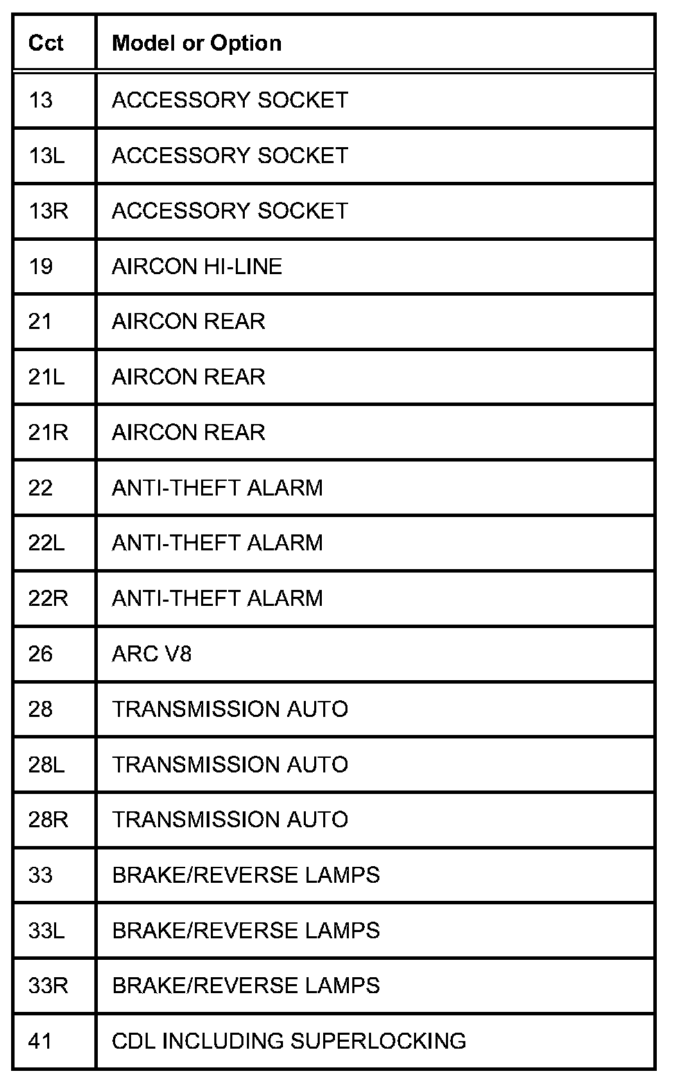 The following table contains a list of circuit (Cct) reference numbers against a description of the applicable model or option. This information should be used in conjunction with the connector pin-out tables to determine the wire configuration of the vehicle under test.
