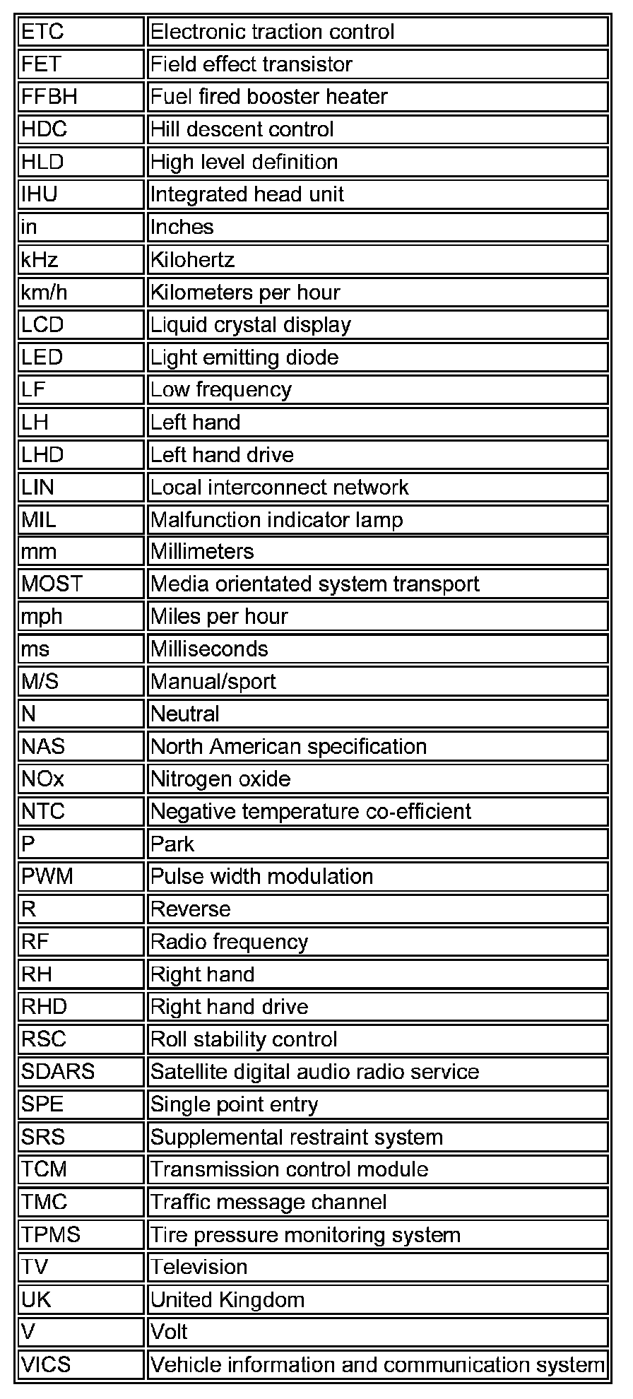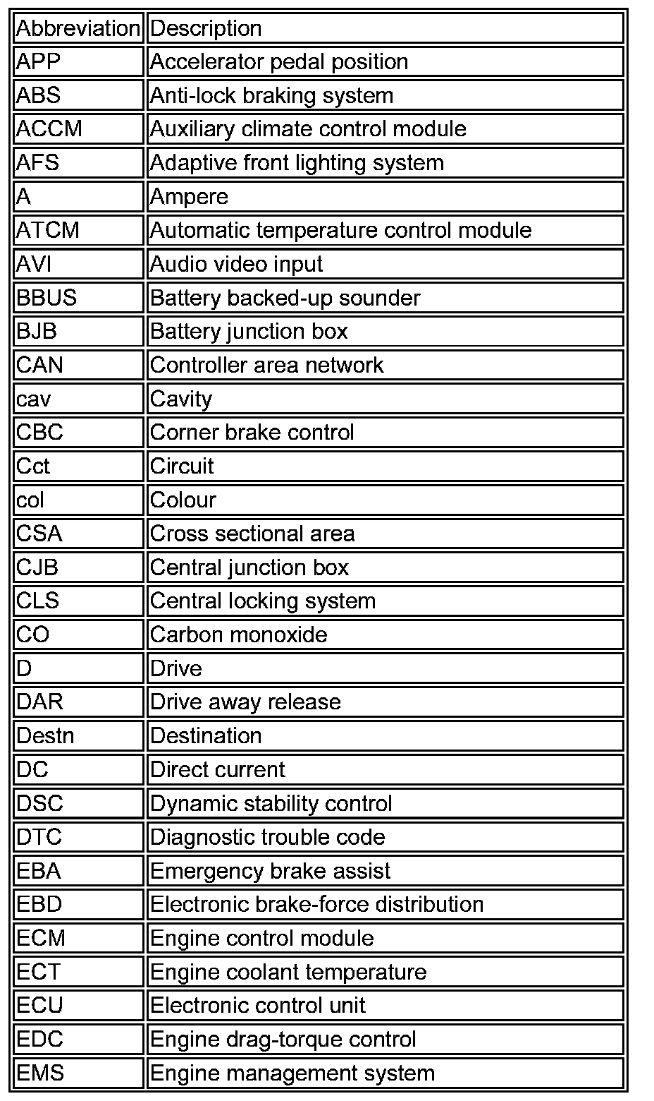 The following list contains wire colour codes used on the vehicle harnesses.