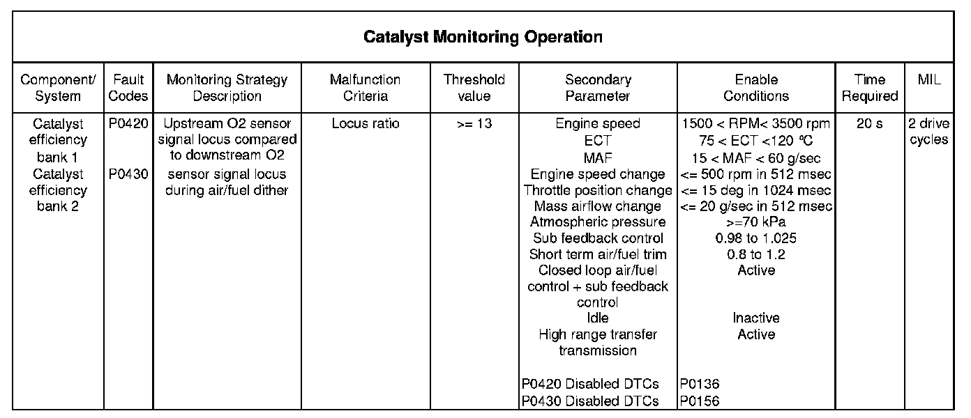 If the above table does not include details of the following enabling conditions: - IAT, ECT, vehicle speed range, and time after engine start-up then the state of these parameters has no influence upon the execution of the monitor.