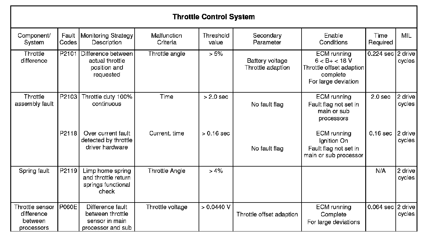 If the above table does not include details of the following enabling conditions: - IAT, ECT, vehicle speed range, and time after engine start-up then the state of these parameters has no influence upon the execution of the monitor.