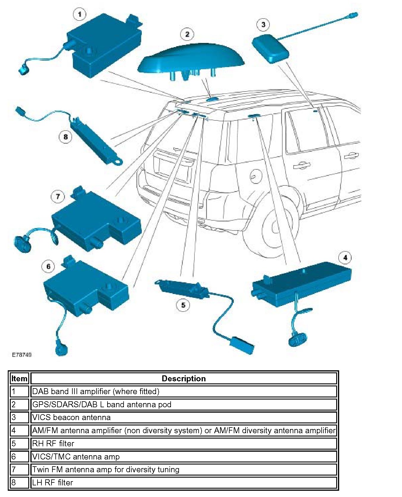 ^ SDARS antenna (NAS only) (NAS only, roof pod mounted) or DAB antenna (where fitted, roof pod)