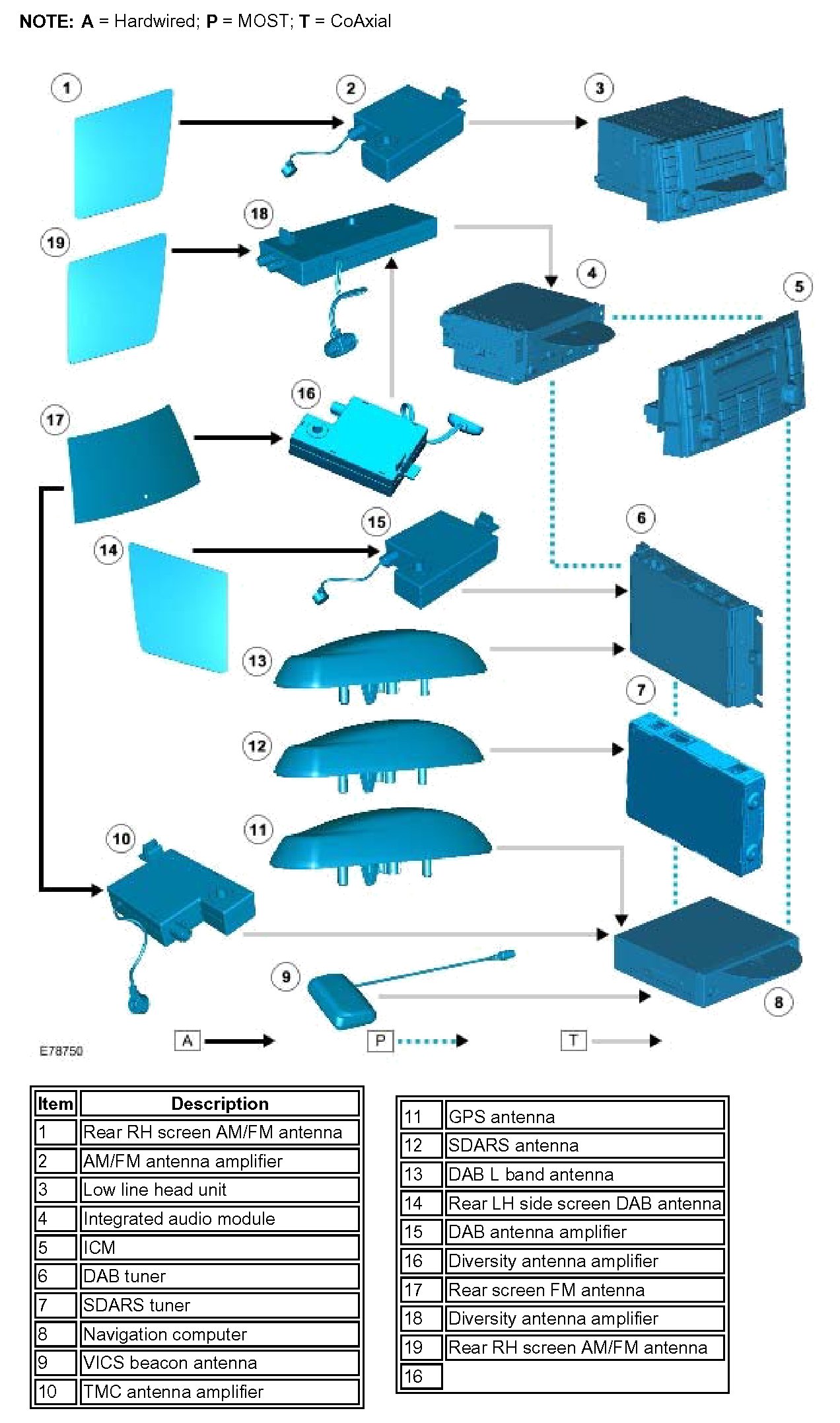 ^ Digital Audio Broadcasting (DAB) system antenna (side screen or roof pod mounted depending on system)