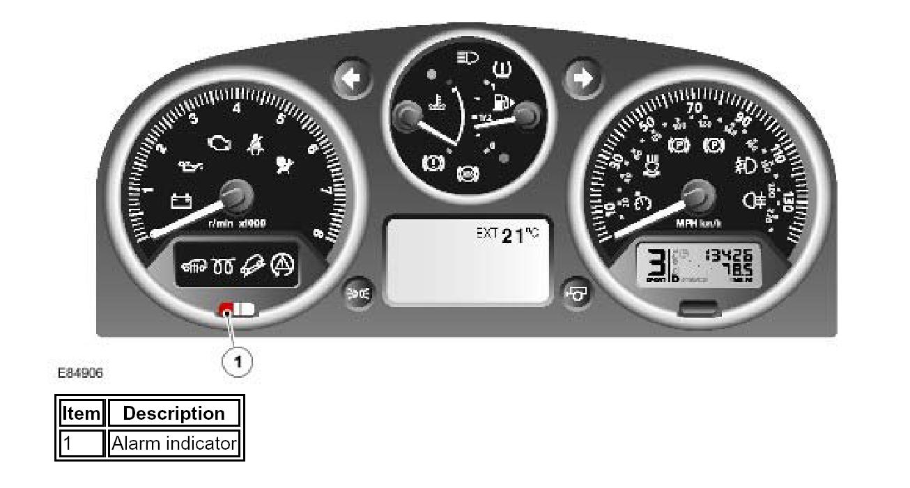 The alarm indicator is a Light Emitting Diode (LED) located in the instrument cluster. When the ignition is off, the indicator gives a visual indication of the active anti-theft system to show if the alarm system is set or unset.