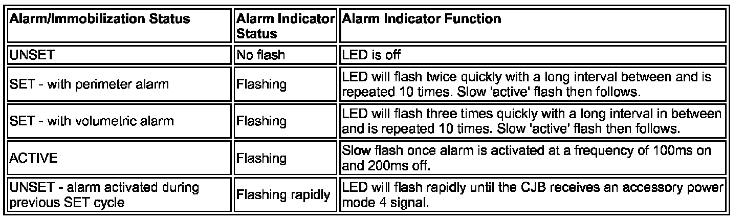 Operation of the alarm indicator is controlled by the instrument cluster which varies the flash rate of the LED to indicate the system status of the alarm and the immobilization systems.