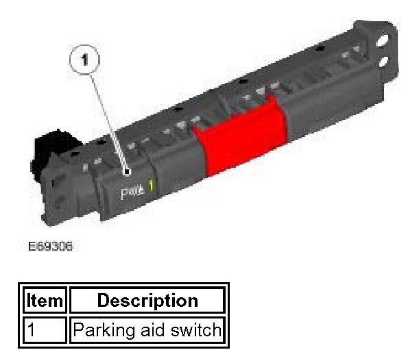 The parking aid switch is located in the instrument panel switch pack, above the touch screen. The switch is the LH switch with an integral LED.