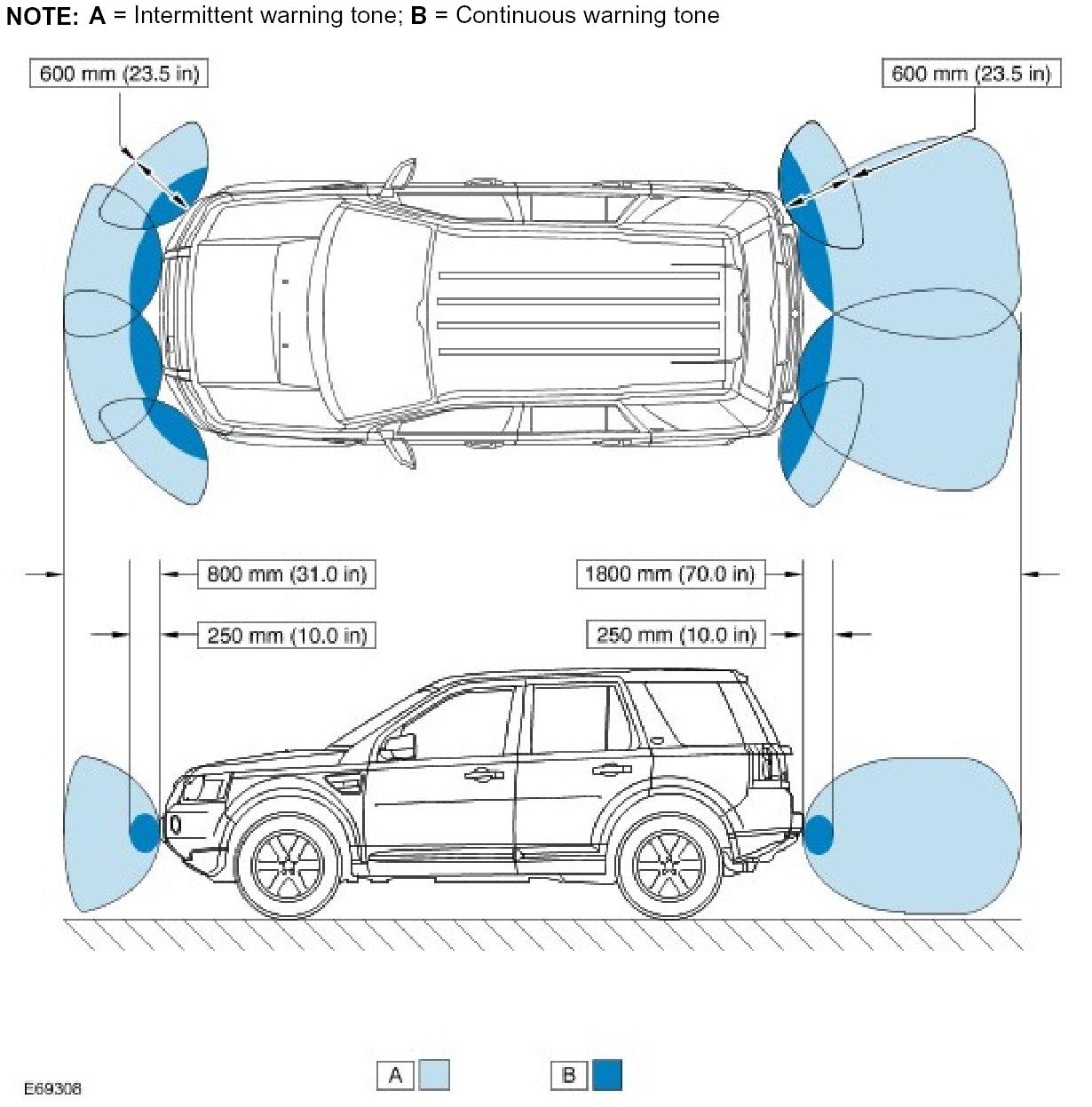 If no objects are detected there are no further warning tones. If an object is detected, repeated audible tones are emitted from either the front or rear audio speakers as appropriate. The time delay between the tones decreases as the distance between the object and the vehicle decreases, until at approximately 250 mm (10 inches), the audible tone becomes continuous.