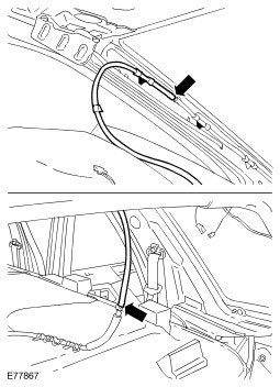 ^ If a headliner is to be replaced, it is imperative that the washer hose and wiring harness are installed to their original positions. Failure to follow these instructions may impede the side air curtain module performance.