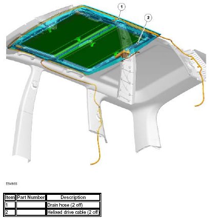 The front half of the roof opening panel is electrically operated through a 2 way rocker switch located in the roof console. An electric motor, attached to the rear of the roof opening panel frame, drives the front glass panel to the tilt, open or closed position. The glass panel is operated by 2 cables, which are driven by the motor.
