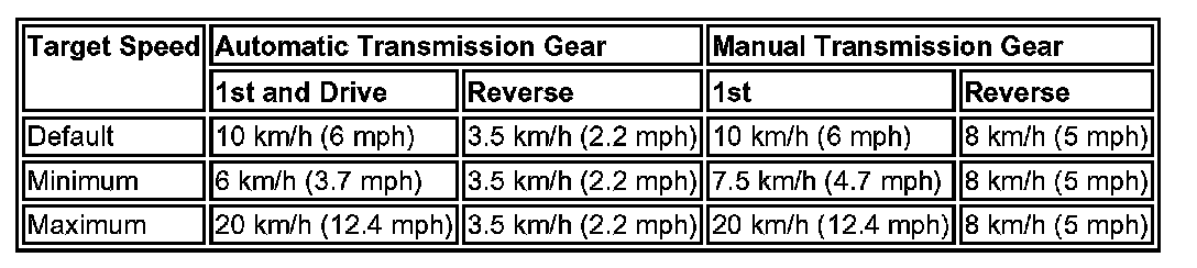The target speed varies between minimum and maximum values for each gear and transmission range, depending on driver inputs through the foot pedals. If the foot pedals are not operated, the ABS module adopts a default target speed: