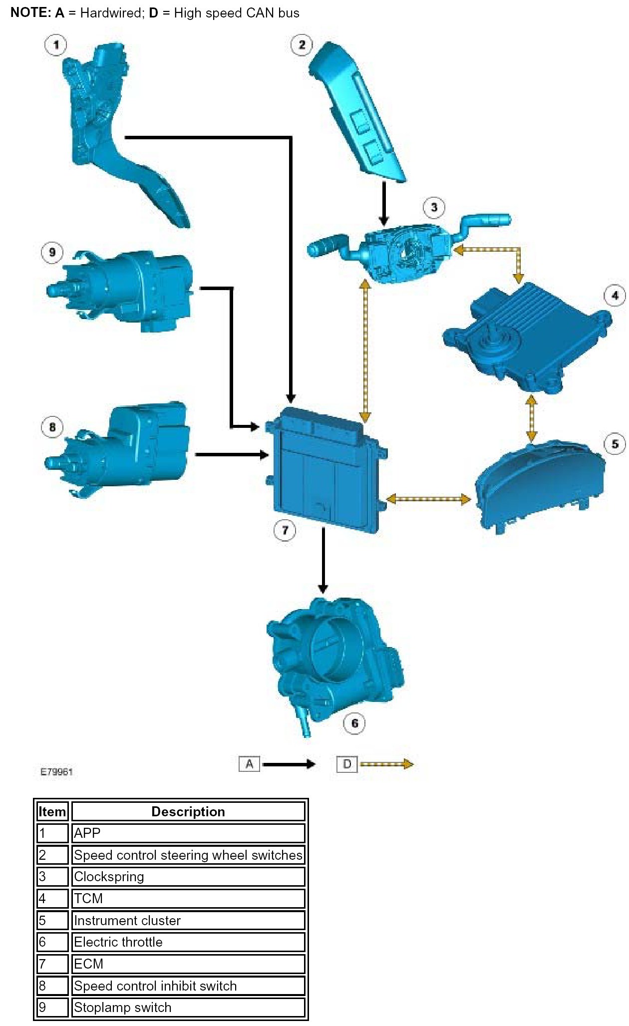 The speed control system also uses inputs from the brake pedal switch, the APP sensor, the ECM and the ABS control module.