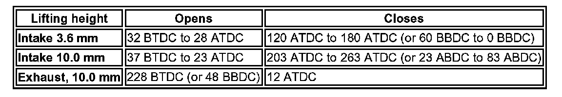 ^ Opening angle, 3.6, mm lifting height: Crankshaft degrees - 152° Crankshaft degrees - 76°