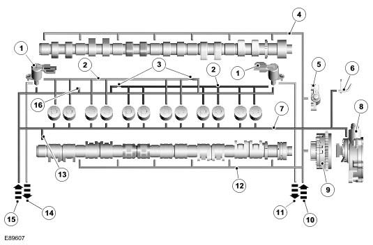The intake camshaft is equipped with the VCT unit. The intake camshaft also drives the vacuum pump.
