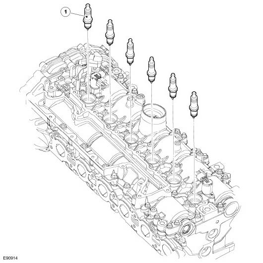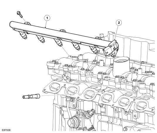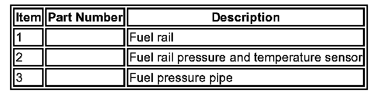 The fuel rail is attached to the intake side of the cylinder head with 3 bolts. Six fuel injectors are installed in the cylinder head and connected to the fuel rail. 'O' ring seals are used to seal the injectors in both the fuel rail and cylinder head. A connection for the fuel pressure pipe is located between injectors 1 and 2.