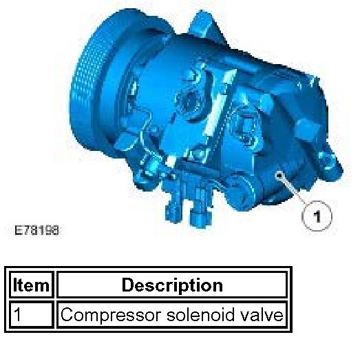 The compressor solenoid valve is integral with the A/C compressor. Operation of the solenoid valve is controlled by the ECM using a Pulse Width Modulated (PWM) signal of differing values. By controlling the flow of refrigerant (displacement) through the compressor, the solenoid valve can control evaporator operating temperature and cabin humidity by varying the pressure within the A/C system.