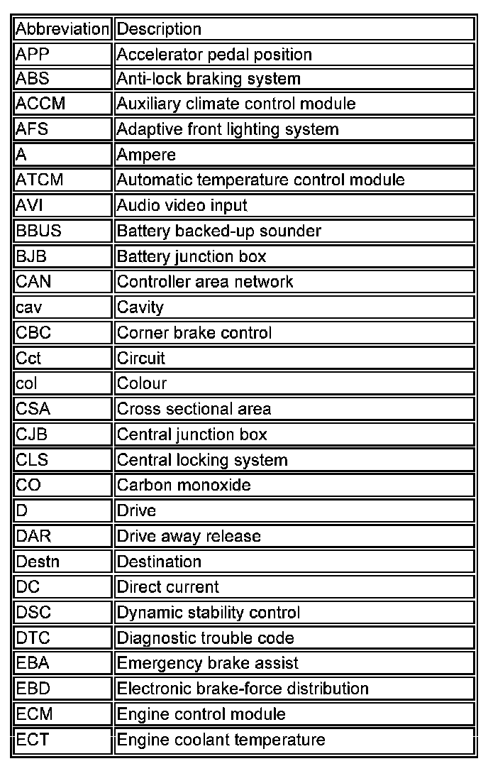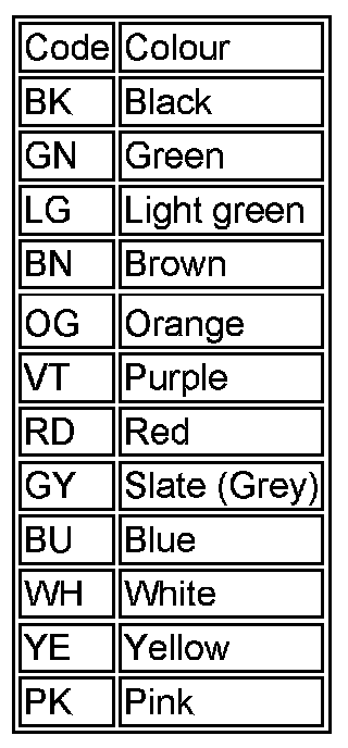 The following list contains wire colour codes used on the vehicle harnesses.