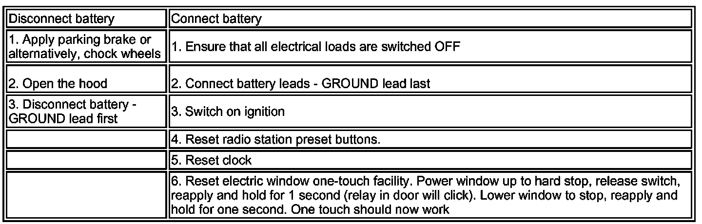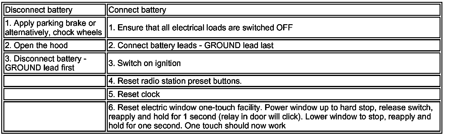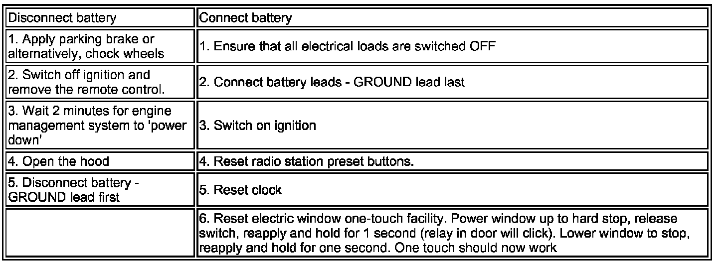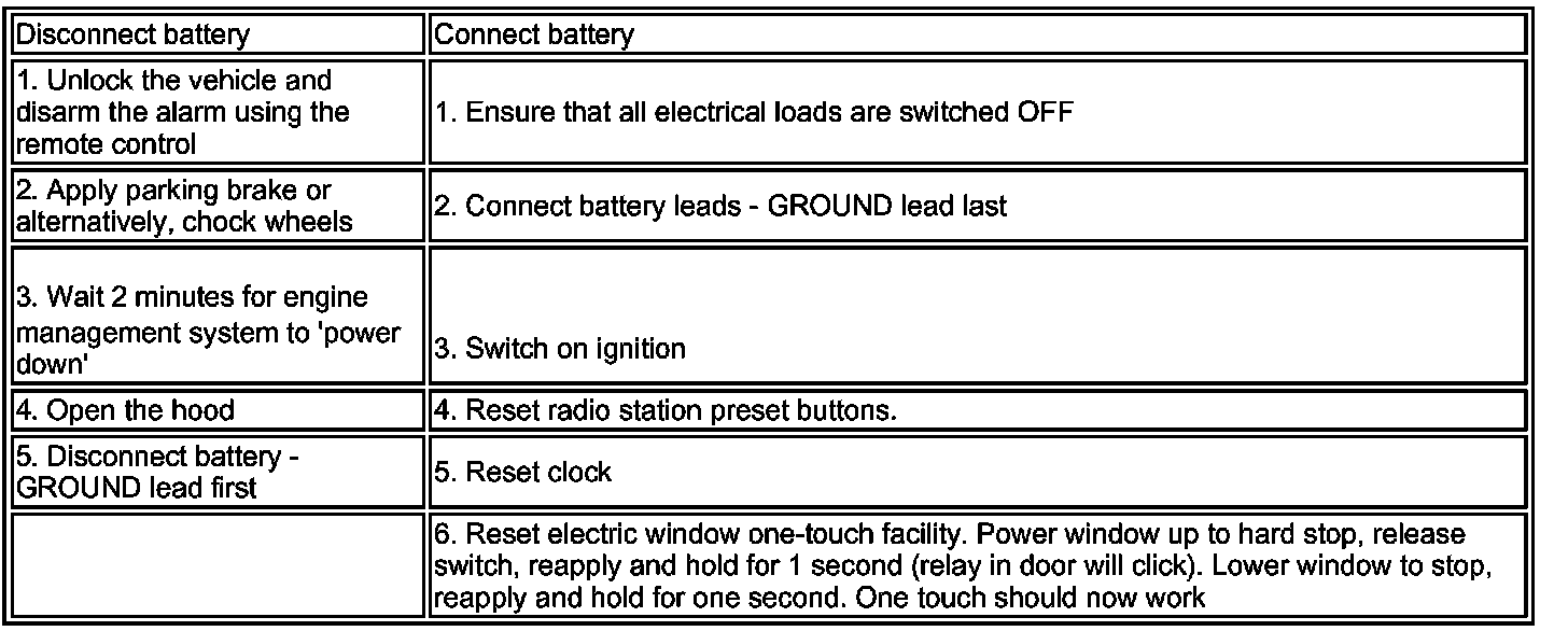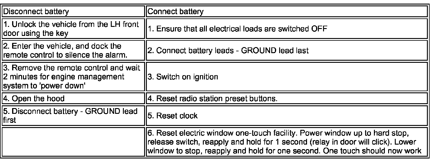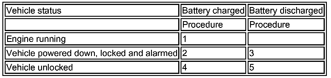 CAUTION: The vehicle status and battery condition must be established before attempting battery disconnect/connect. Reference must be then made to the following table to establish the relevant procedure to be followed.