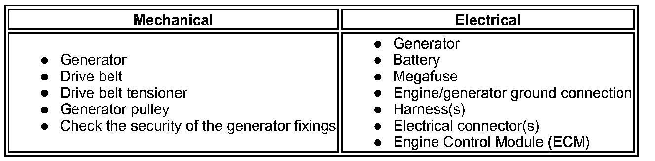 NOTE: Check the vehicle battery condition and state of charge before condemning any of the charging system components.