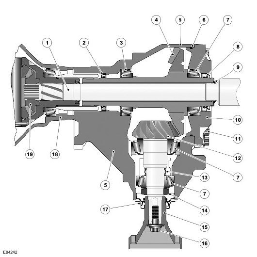 Drive from the transmission differential drives the crown wheel drive gear, which in turn rotates the pinion gear. Drive is passed from the pinion gear to the drive shaft and the rear differential via the drive flange attached to the pinion gear shaft.