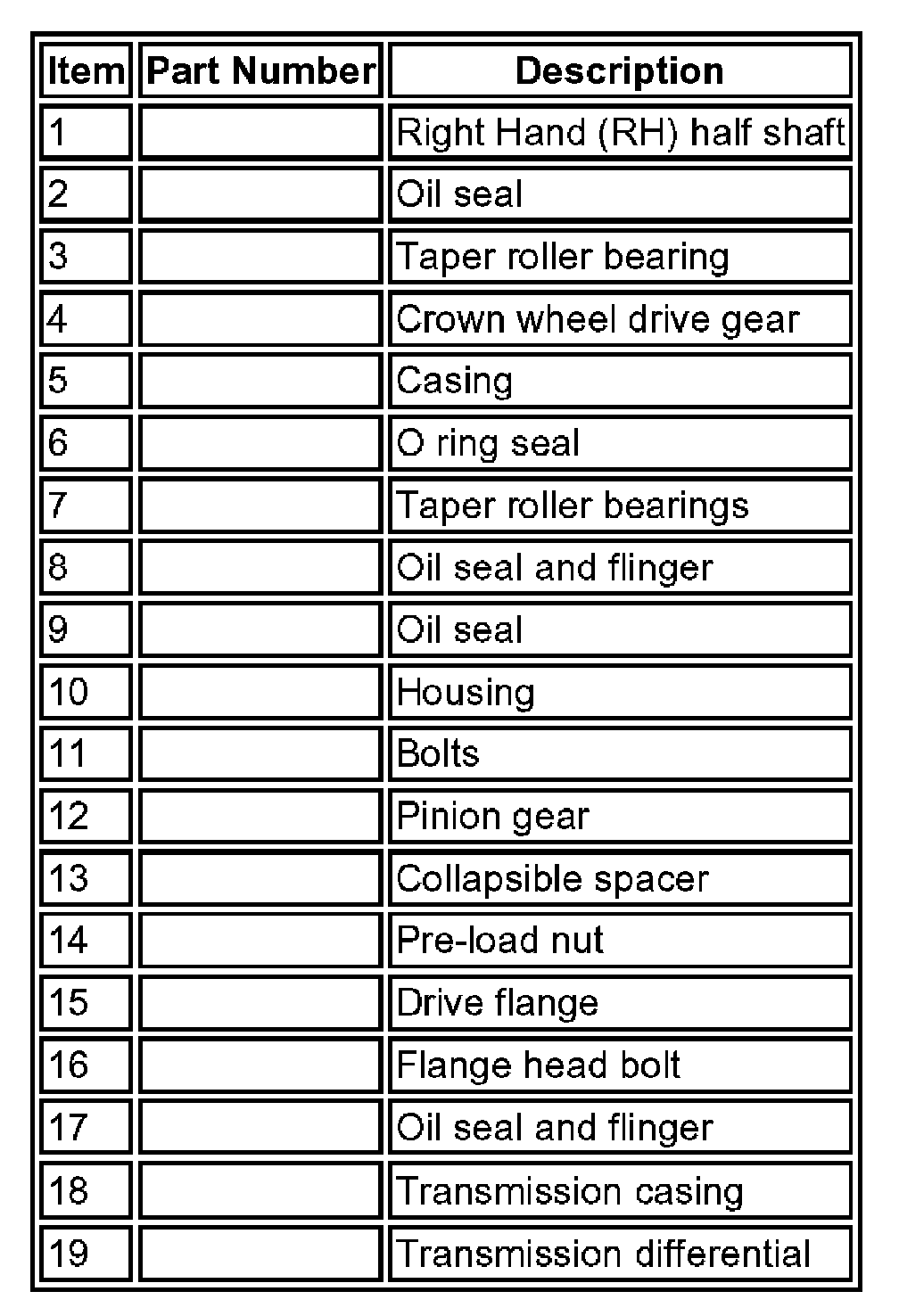 The crown wheel drive gear is mounted longitudinally across the unit. The Left Hand (LH) end of the gear has splines which mate with corresponding splines in the transmission differential output sleeve. The drive gear is hollow which allows for the fitment of the Right Hand (RH) half shaft. The half shaft is located through the hollow drive gear and mates with splines in the transmission differential. The half shaft is driven by the transmission differential and receives no drive from the power transfer unit.