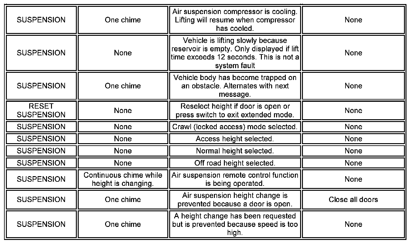 ^ This group of messages relate to low priority messages, 'WASHER FLUID LOW' for example. Depending on the message, some messages are only shown at the end of a journey to avoid annoyance to the driver. The messages will be accompanied by a chime when the ignition is switched off to alert the driver to their presence.