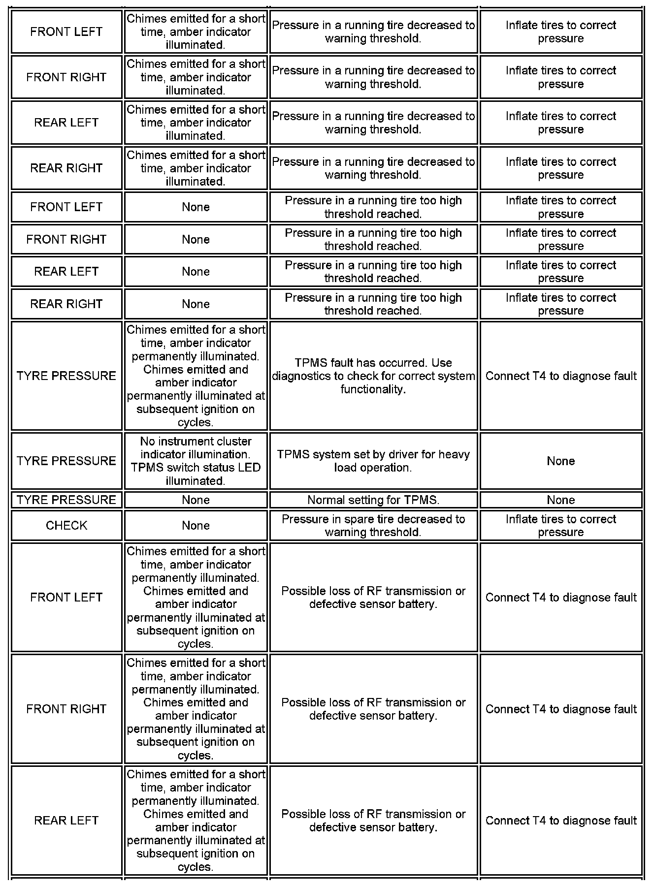 The messages are displayed in a language applicable to the market configuration of the vehicle and can be changed using T4. The following list shows the possible messages which can be displayed, other visual or audible warnings and a description of the message.