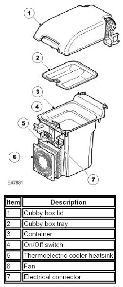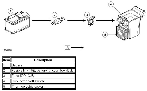 Operation of the thermoelectric cooler is controlled by an on/off switch on the top front edge of the container. A permanent battery feed is supplied to the on/off switch from the central junction box (CJB). A light emitting diode (LED) in the on/off switch is illuminated while the cool box is selected on.
