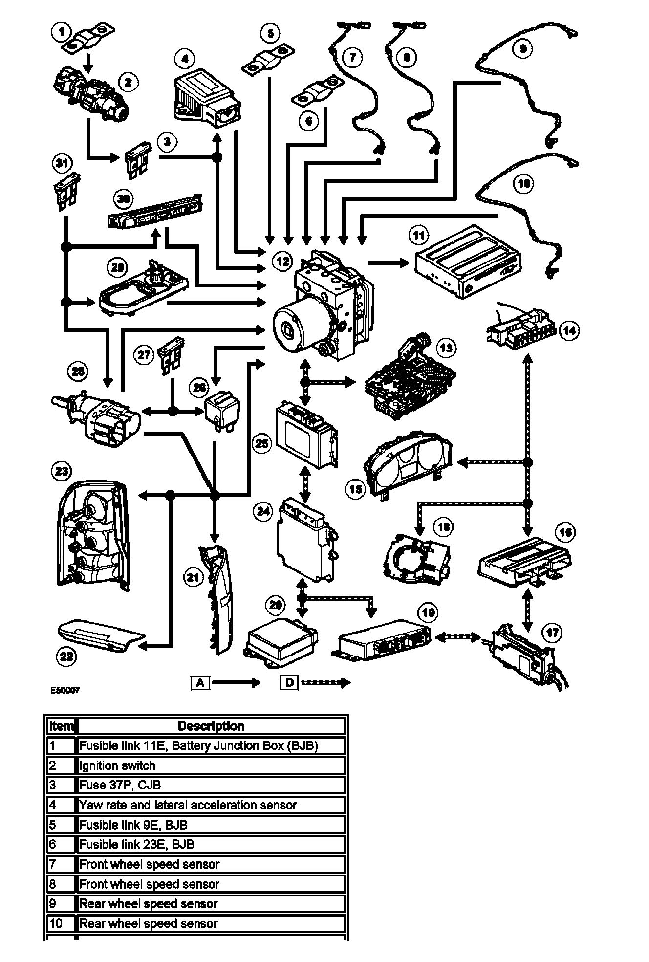 The ABS module monitors the tracking stability of the vehicle using inputs from the wheel speed sensors, the steering angle sensor and the yaw rate and lateral acceleration sensor. The tracking stability is compared with stored target data and, whenever the tracking stability deviates from the target data, the ABS module intervenes by applying the appropriate brakes. On vehicles with an automatic transmission, when the DSC function is active, the ABS module also signals the Transmission Control Module (TCM) to prevent gear shifts. If necessary, the ABS module also signals: