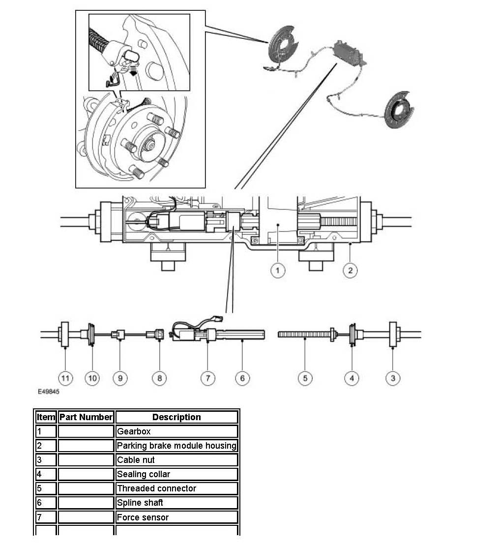 The inner cable of the LH brake cable is connected to the spline shaft by a threaded connector (LH thread); a squared flange at the end of the threaded connector locates in the housing of the parking brake module, to prevent the threaded connector from turning with the spline shaft.