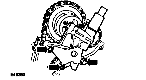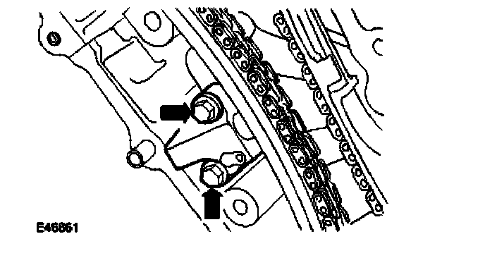 14. Install the RH secondary timing chain tensioner retaining bolts.