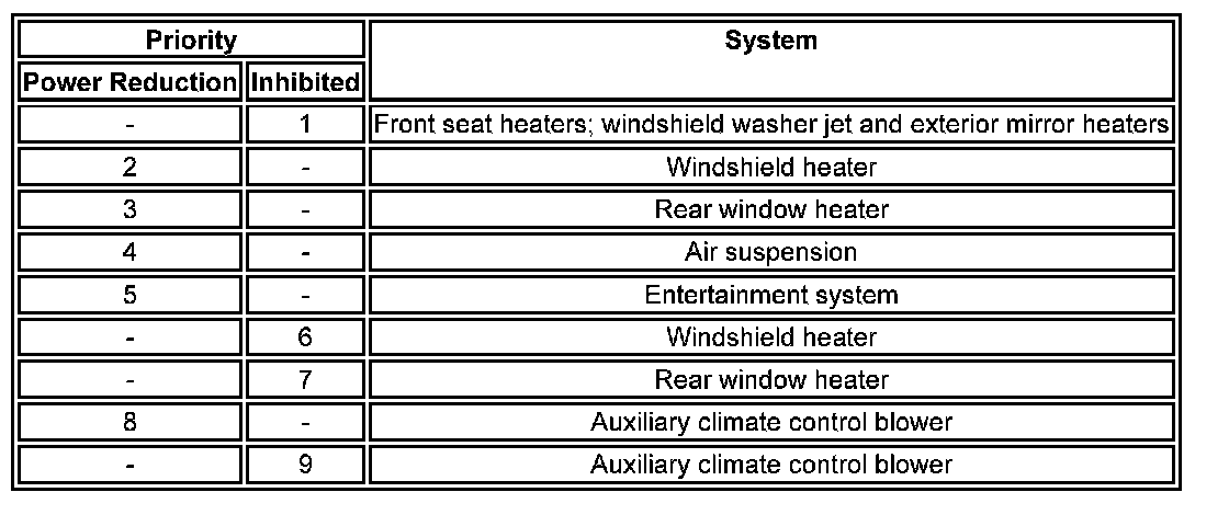 If the electrical load is more than the maximum load available, the ATCM requests an increase of engine idle speed using the medium speed CAN bus message to the ECM. If an electrical load imbalance remains after an increase in engine idle speed, or if the electrical load is more than the capacity of the charging system, the ATCM reduces the electrical load by reducing the power of some vehicle systems or inhibiting their operation. The number of systems controlled depends on the electrical load reduction required. The systems controlled, and the order in which their power is reduced or they are inhibited, are contained in three priority tables. The table used depends on the ambient air temperature, battery temperature and engine coolant temperature: